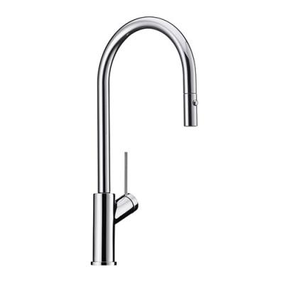 Einhebelmischer. Mit schwenk-/herausziehbarem Metallauslauf (Strahl/Brause umstellbar), seitlichem Hebel und Keramikkartusche.