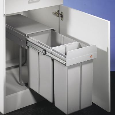Mithilfe des funktional und durchdacht konzipierten Mülltrennsystems Double 3 kann Biomüll und sonstiger Abfall hygienisch entsorgt werden. Das System kommt in Kombination mit Drehtür-Schränken zum Einsatz. Die minimale Einbaubreite liegt bei 300 mm. Bei breiteren Unterschränken bleibt Abstellfläche beispielsweise für Putzmittel und weitere Utensilien erhalten. Das Set umfasst zwei Mülleimer mit einem Volumen von jeweils 20 und 10 Liter und deckt damit den üblichen Bedarf kleinerer Haushalte. Ein robuster Vollauszug mit leichtgängigen Laufleisten erleichtert den Gebrauch, da die Müllbehälter zum Entleeren mühelos herausnehmbar sind. Sie werden aus Materialien gefertigt, die hohen Hygieneansprüchen gerecht werden. Die Montage des Tragegestells erfolgt auf dem Schrankboden. Der über die gesamte Länge fest verankerte Deckel umfasst beide Abfallsammler und kann als zusätzliche Ablage genutzt werden.