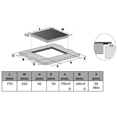 Abmessungen Kochfeld: 770 x 520 x 60 mm