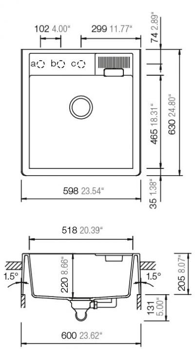 Hinweis: Die Arbeitsplatte muss auf beiden Seiten 5mm länger geplant werden, da die Spüle konisch gearbeitet ist.