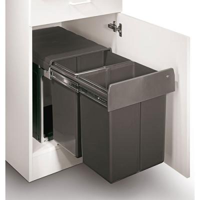 Das Mülltrennsystem Double Master Maxi 40 DT eignet sich mit einem großen Füllvolumen von 40 Litern hervorragend für Mehrpersonenhaushalte. Es kommt in Küchenschränken zum Einsatz, die mit einer Drehtür ausgestattet sind. Die zwei dazugehörigen Behälter mit einem Fassungsvermögen von jeweils 20 Litern ermöglichen ein übersichtliches Trennen von beispielsweise recyclebaren Wertstoffen und Bioabfall. Zur Grundausstattung des Mülltrennungssystems gehört ein Komplettdeckel, sodass Gerüche nicht direkt in die Küche entweichen. Innerhalb der Serie stehen passend zum vorhandenen Platz weitere Varianten mit unterschiedlichen Maßen zur Verfügung. Je nach Ausführung können Abfalleimer mit anderen Füllvolumina für die Trennung des Hausmülls verwendet werden. Die Montage des Mülltrennsystems erfolgt unkompliziert auf dem Schrankboden.