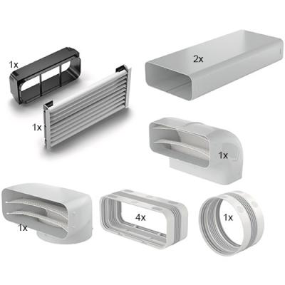 Das COMPAIR Prime 150 flow® Sockel-Lüftungsgitter Set mit Rundanschluss für Siemens-Hauben ist ein System zur Ableitung von Kochwrasen bei Kochinseln. Geeignet ist es insbesondere für Muldenlüftungs- oder Downdraft-Systeme im Umluftbetrieb. Das Set ist Teil des fortschrittlichen COMPAIR Prime flow®-Konzepts, das über strömungsoptimierte Luftleitkörper verfügt. Dadurch wird der Kochdunst sicher aus dem Schrankkorpus abgeleitet, bei gleichzeitig geringer Geräuschentwicklung. Das Umluftset besteht aus einem Flachkanalrohr-System der Stärke 150 mm. Weiterhin ist es mit 90°-geführten Rohrbögen und Umlenkstücken ausgestattet. Universalverbinder mit beweglichen Kompensatoren ermöglichen eine flexible Führung des Kanals. Sie lassen sich dank des N-Klick-Systems mit Rasterelementen mühelos und werkzeugfrei zusammenstecken. Den Abschluss bildet das Sockel-Lüftungsgitter flow in eleganter Optik.