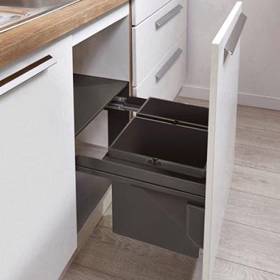 Der WESCO® Pullboy Soft Comfort 360 K/500-2 stellt ein vielseitiges Abfallsystem für Frontauszüge in der Küchengestaltung dar. Es lässt sich in Schrankbreiten von 500 mm einbauen. Für die Abfalltrennung stehen zwei unterschiedlich große Behälter von 17 und 11 Litern zur Verfügung. Sie lassen sich getrennt herausnehmen und besitzen eine eckige Form. Insgesamt beläuft sich das zur Verfügung stehende Abfallvolumen auf 28 Liter. Ausgestattet ist das Mülltrennsystem mit einem ausziehbaren Deckel. Er kann auch als praktische Ablage dienen. Damit Müllbeutelrollen und andere Kleinteile nicht wegrollen, lässt sich die zugehörige Antirutscheinlegematte verwenden. Technologien wie Softeinzug und Dämpfung sorgen für ein leises und fast automatisches Schließen des Einzugs. Gefertigt ist die Müllsammelstation aus robustem und langlebigem Kunststoff in der neutralen Farbe Anthrazit. Sie wird in der Seitenwand des Unterschranks montiert und mit der Frontblende verbunden. Je nach Platzangebot im Schrank lässt sich oberhalb noch ein Utensilienschubfach installieren.