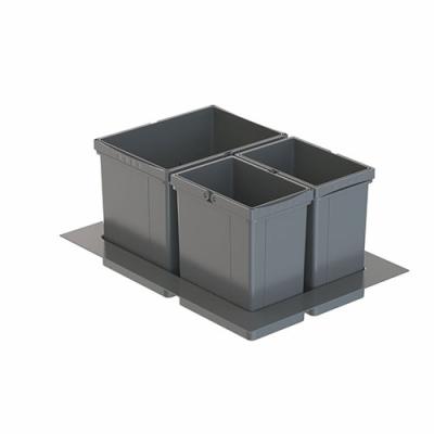 Mit dem Abfallbehälter Pullboy Versa 265 S/500-3 mit minimaler Einbautiefe lassen sich Haushaltsmüll und Wertstoffe zuverlässig trennen. Durch die Montage auf vorhandenen Auszügen kann er schnell und leicht im Küchenschrank eingebaut werden. Für das Sammeln und Trennen von Abfällen stellt der Mülleimer ein Abfallvolumen von 29 Litern zur Verfügung, das sich auf drei Behälter verteilt. Während die beiden kleineren Einbaumülleimer ein Fassungsvermögen von je 7 Litern besitzen, hat der größere Innenbehälter ein Volumen von 15 Litern. Um eine unangenehme Geruchsbildung zu reduzieren, verfügt das Mülltrennungssystem über passende Einzeldeckel und lässt sich optional mit einem Gesamtdeckel verschließen. Dieser kann platzsparend hinter der oberen Front befestigt werden. Für einen sicheren Stand wird der Abfallsammler mit einer praktischen Bodenwanne geliefert.